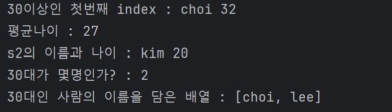 System.out.println("30이상인 첫번째 index : " + s1.getName() + " " + s1.getAge());